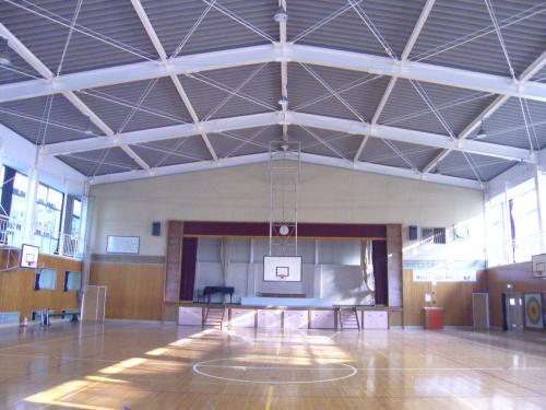 某小学校体育館(S造)の耐震補強工事の設計と施工監理を行いました。体育館の全景写真です。