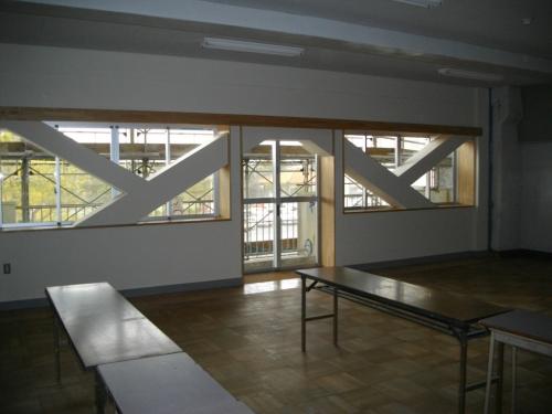 耐震補強後 内部教室より耐震ブレースを示す